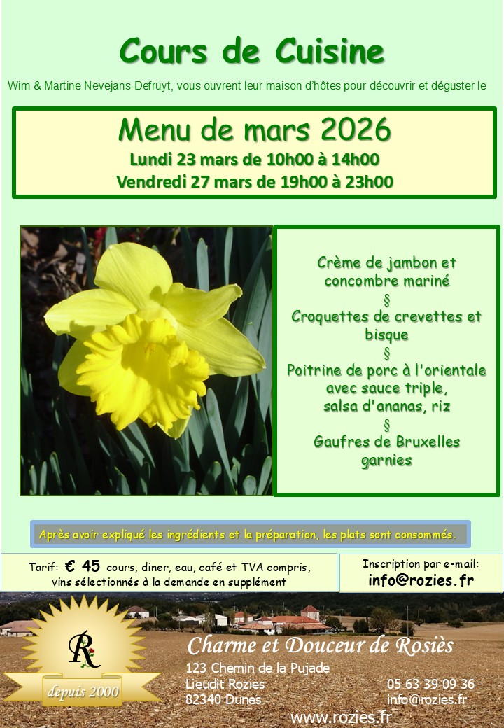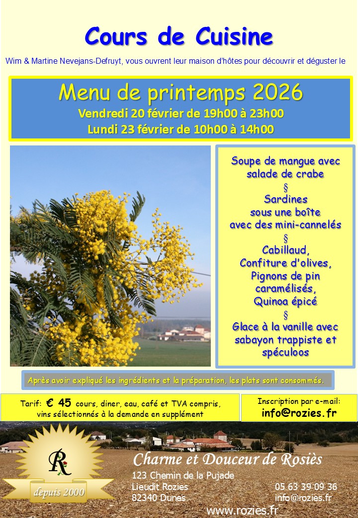 Inscription au préalable par tel. 05 63 39 09 36 ou par e-mail: info@rozies.fr