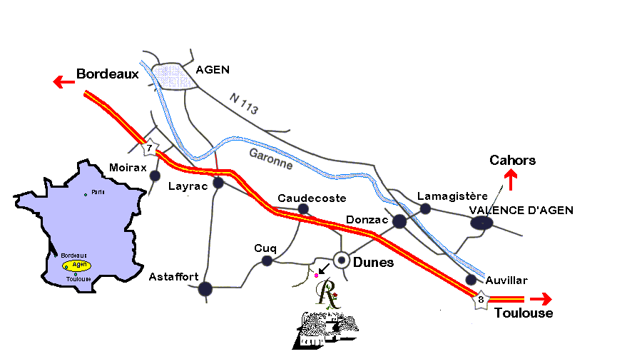 o coming from the west, on the A62 from Bordeaux, take sortie 7 to Layrac, then Dunes.