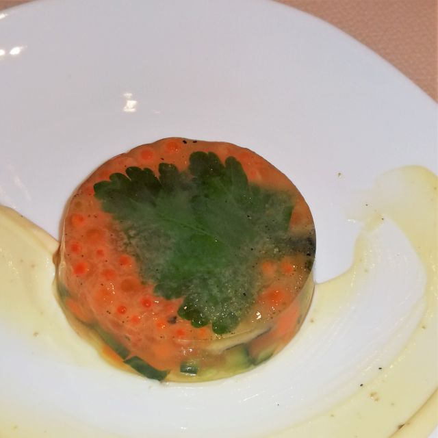 - Schik de terrine op een bordje met truffelmayonaise, uitgestreken