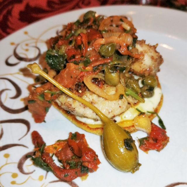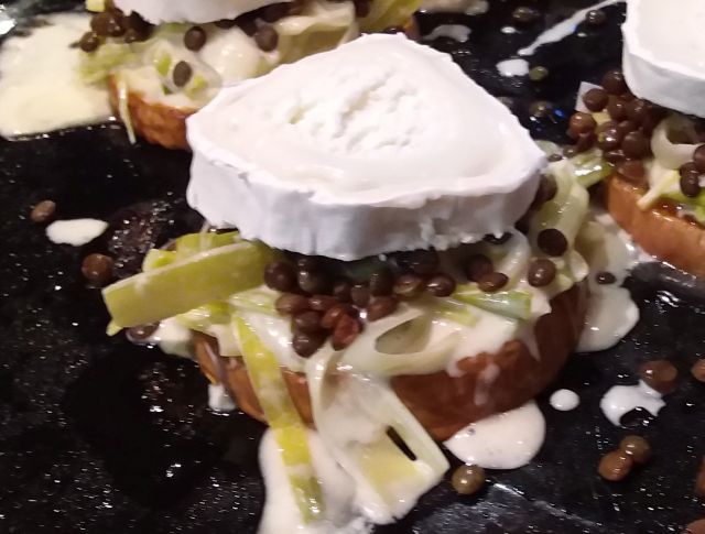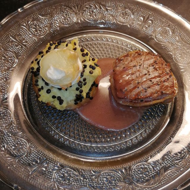 * Aardappelpoffertje met kalfszwezerik en kappertjessalsa