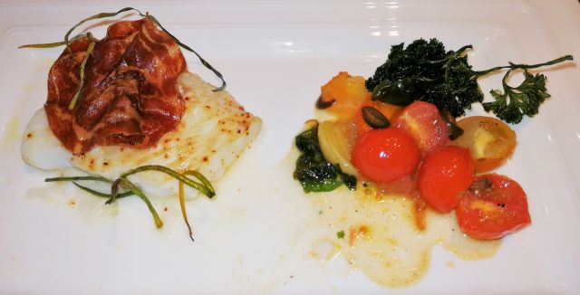 Kabeljauwhaasje met coppa, olijven en gesuikerde tomaatjes