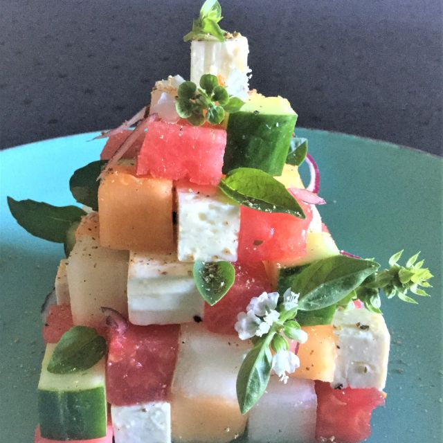 - Snij de gepelde tomaten, komkommer, meloen en feta in blokjes van