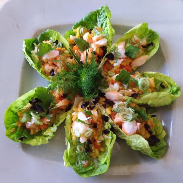 Paella-salade met gekaramelliseerde scampi en dragonknoflooksaus