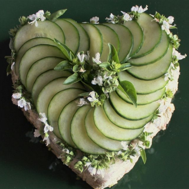 - Werk af met fijne schijfjes komkommer en basilicumbloempjes.