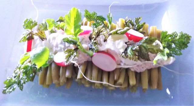 - Overgiet de boontjes met de kruidenmayonaise en werk af met